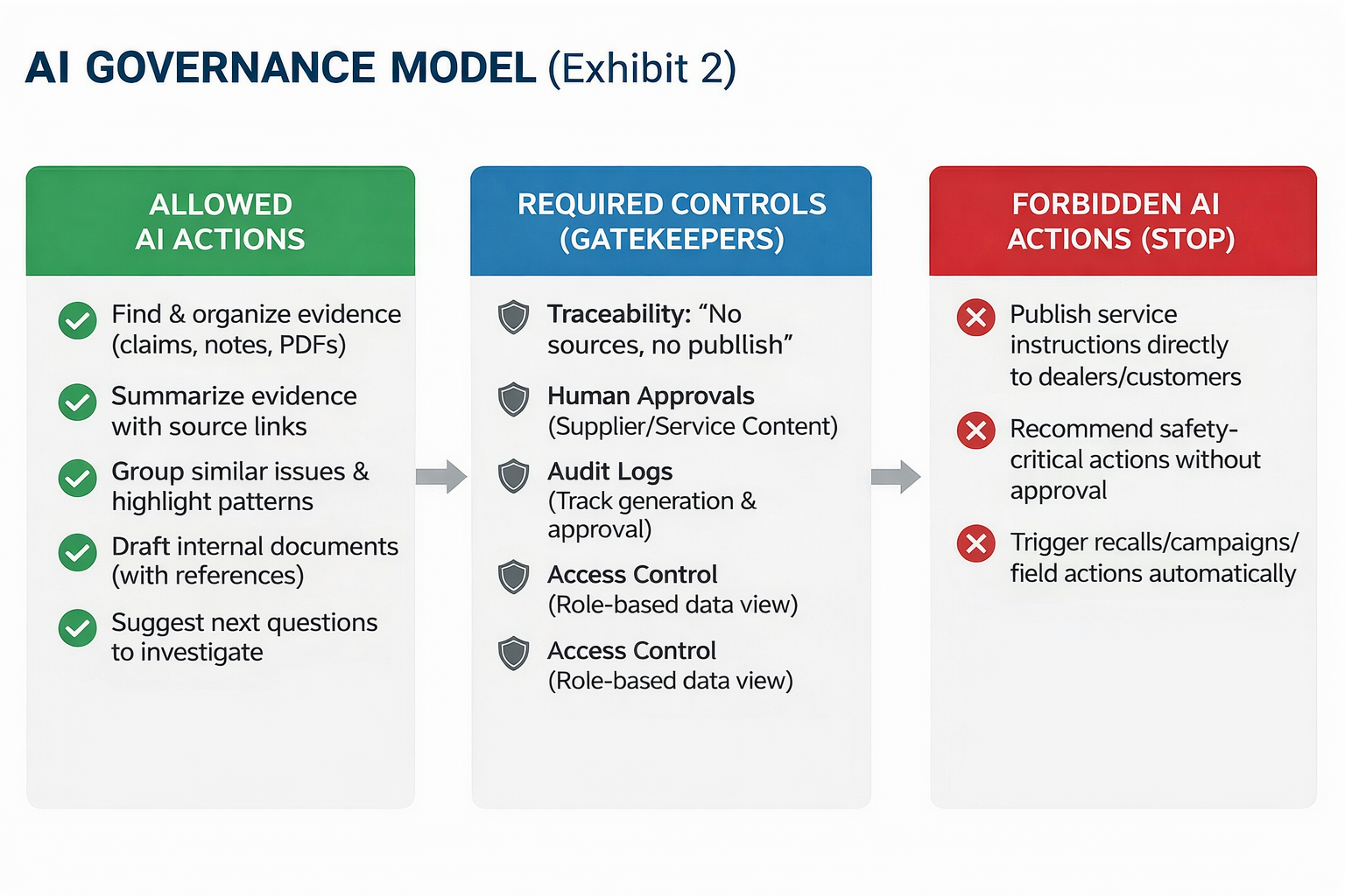 AI may not: publish service instructions externally, recommend safety-critical actions without approval, or trigger field actions autonomously