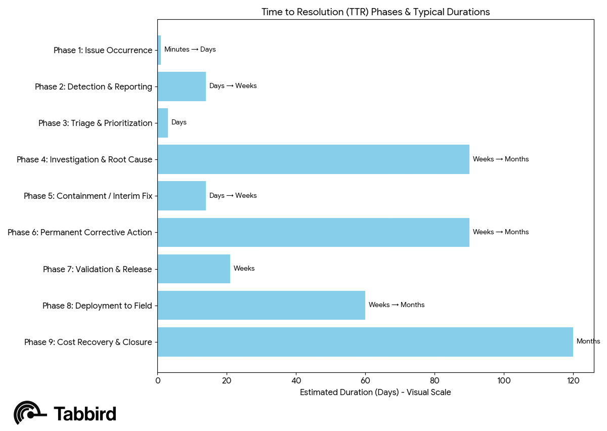 Manufacturers often track time-to-resolution (TTR) or similar measures (time to identify, time to fix). But the most important insight is where cycle time accumulates.